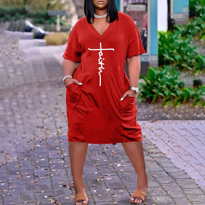 Plus Size Summer Casual Daily Print Basic V Neck Vintage Loose Short Sleeve Red Midi Dress with Pockets