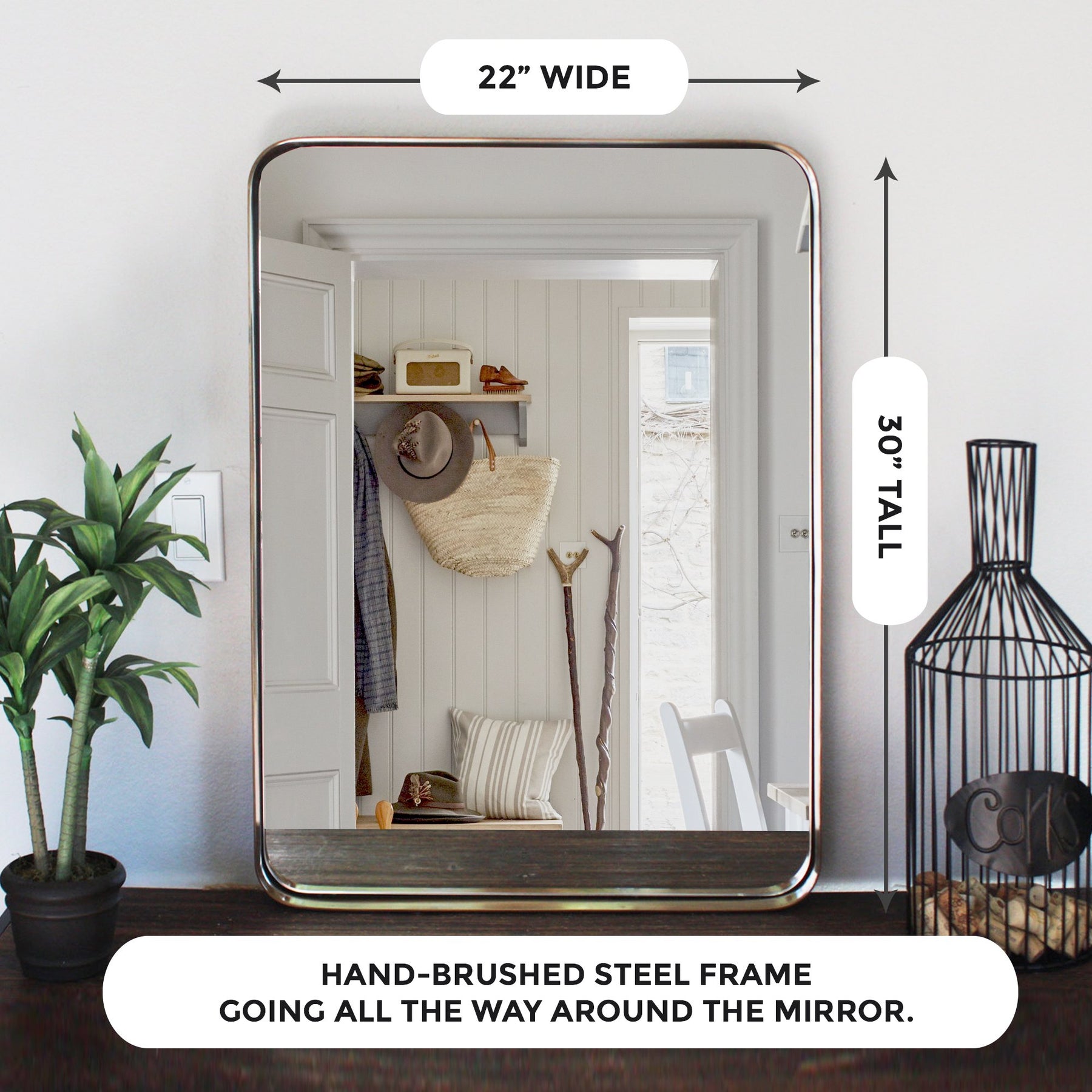 This Gold trimmed mirror is the perfect bathroom vanity mirror. Sized at 22’’ x 30’’ inch, this Rectangle Mirror is the perfect size for your bathroom, bedroom, or entryway. Handcrafted & hand-curated to be an artistic design that’s both functional and stunning. Sophisticated & elegant with a floating glass large bathroom mirror. The size is large enough to stand out in any room and small enough to be able to add 2!
