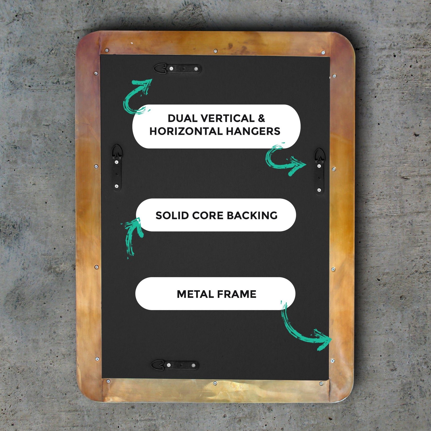 The Golden Metal Frame is a hand brushed brass with round corners and an infinity design above the mirror. The mirror is polished with no visual distortion and a premium MDF back prevents humidity corrosion, making it perfect for your bathroom!