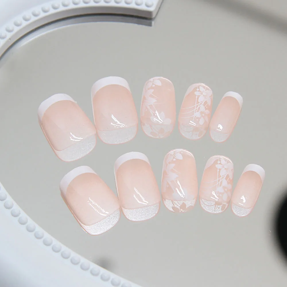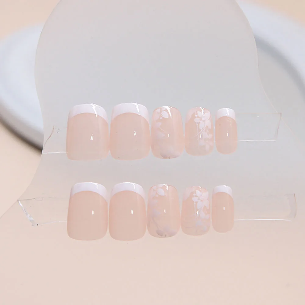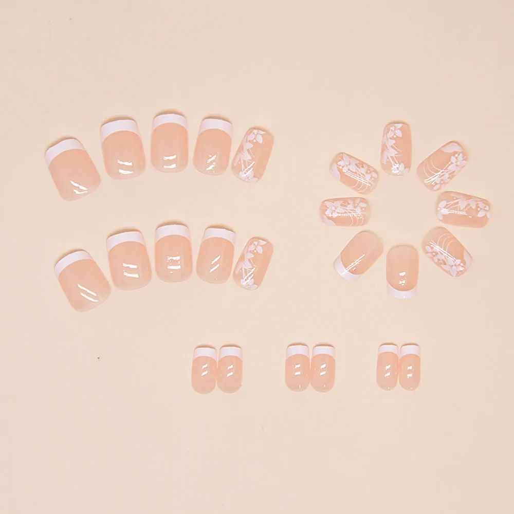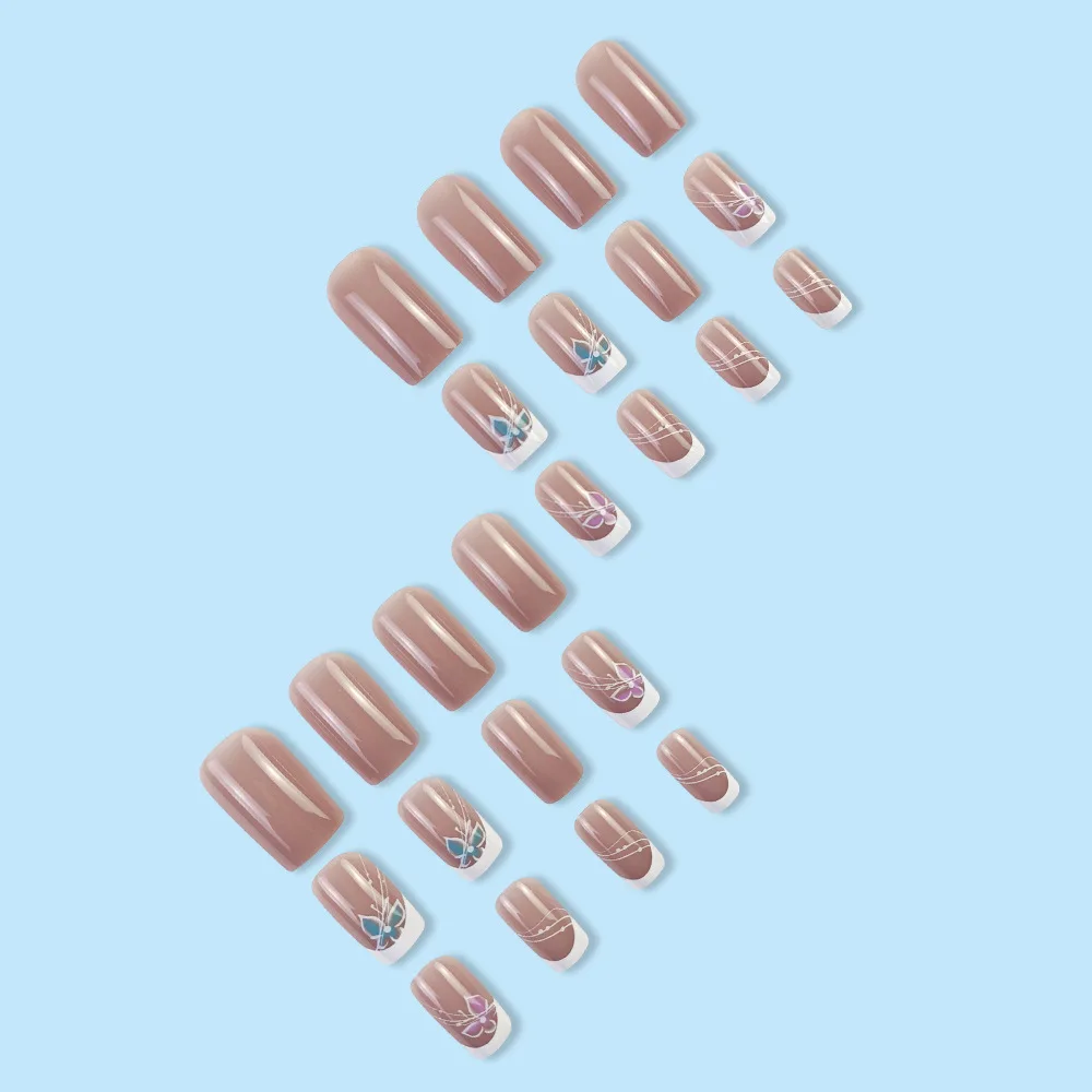 24pcs/set short saure fake nails for Spring summer season french style flowers butterfly design press on false nail art tips