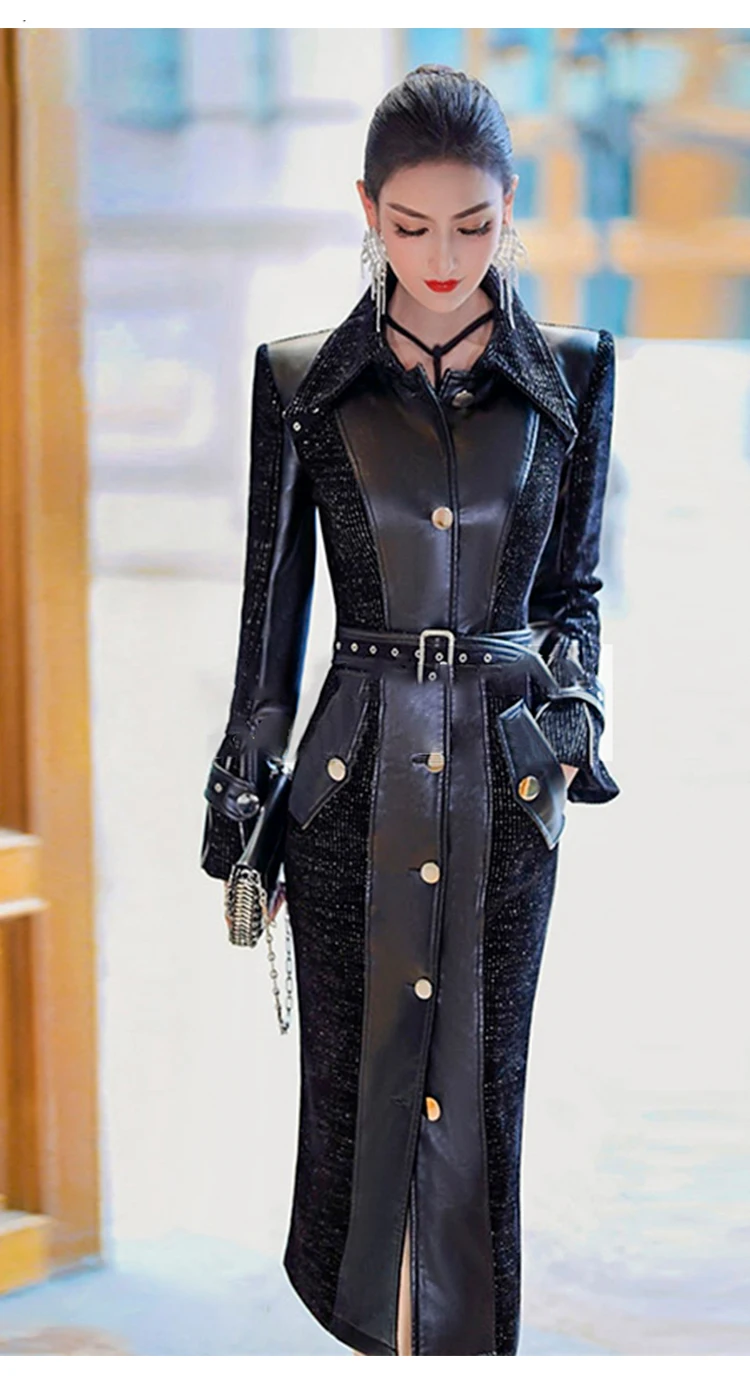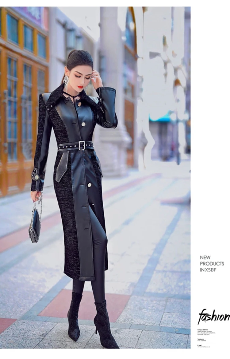 Spring Autumn Long Luxury Elegant Fitted Patchwork Pu Leather Trench Coat for Women Single Breasted Runway Fashion