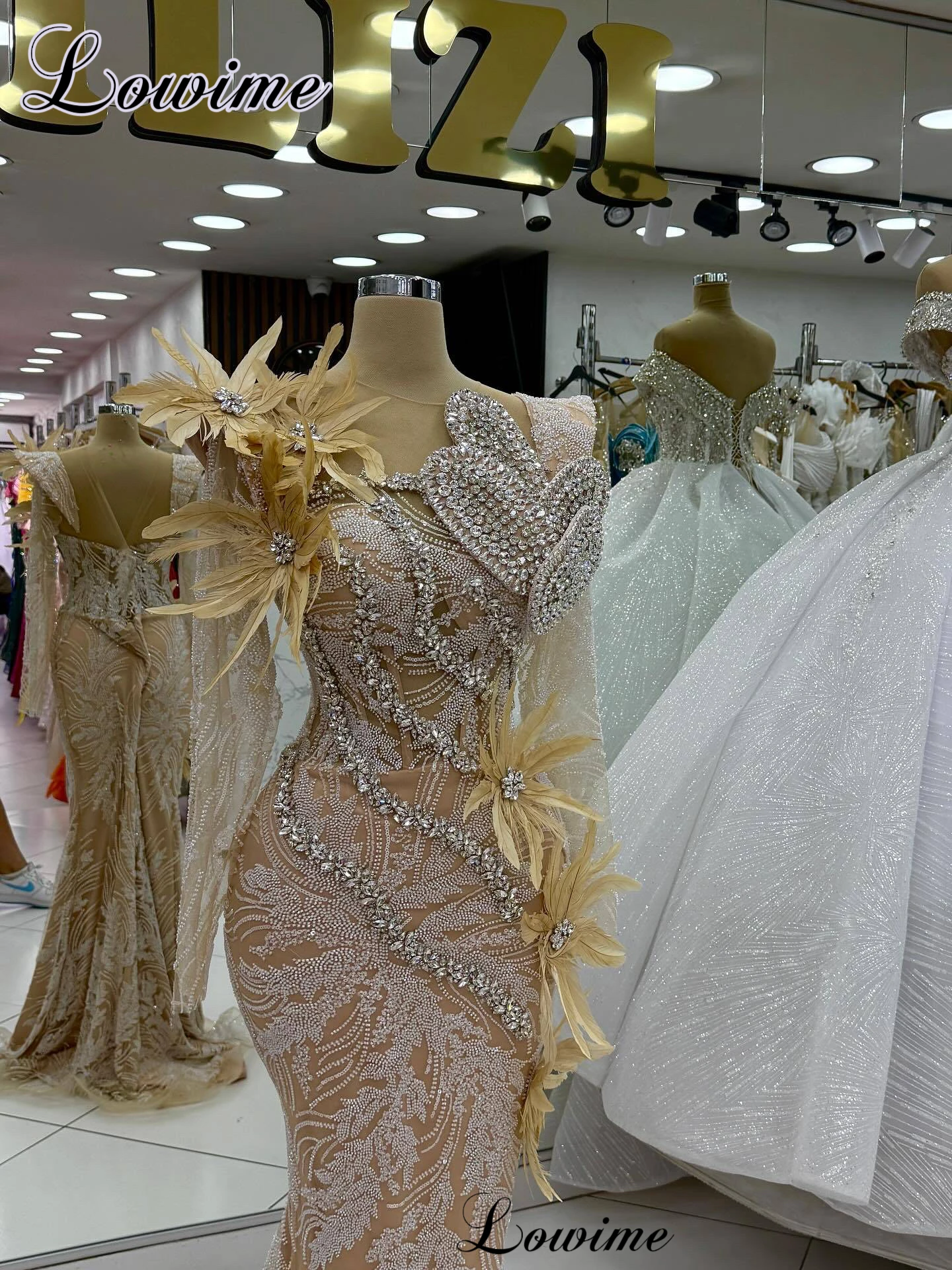 Vintage Champagne Prom Dresses Long Sleeves Evening Dresses With Crystals Wedding Party Dresses Vestidos De Cóctel Customized