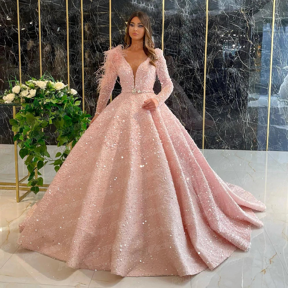 Customized Long Sleeve Sequin Evening Ball Gown For Woman Luxury Glitter Bead V Neck Feather Sweep Train Formal Party Dress