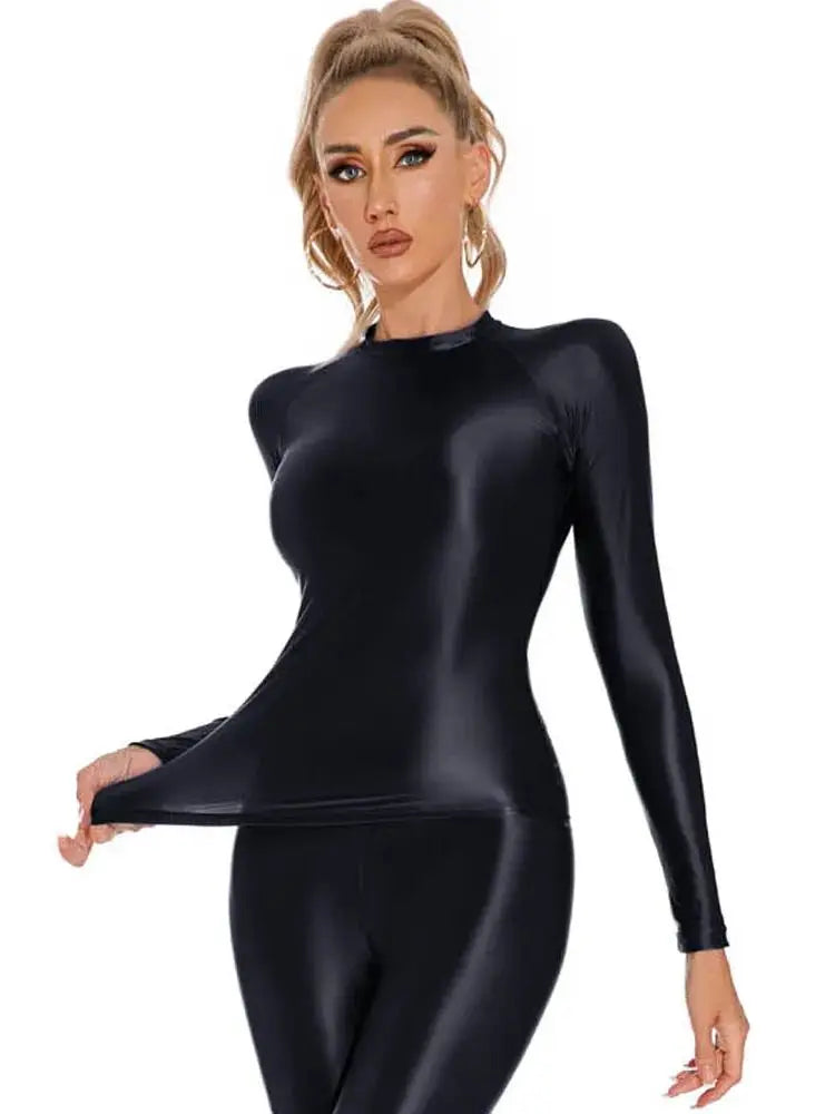 Glossy Shiny Elasitc Long Sleeve Shirt Women Fitness Gym Athletic Yoga Tshirt Tights Hot Sexy Tees Casual Crop Tops Bustier Top