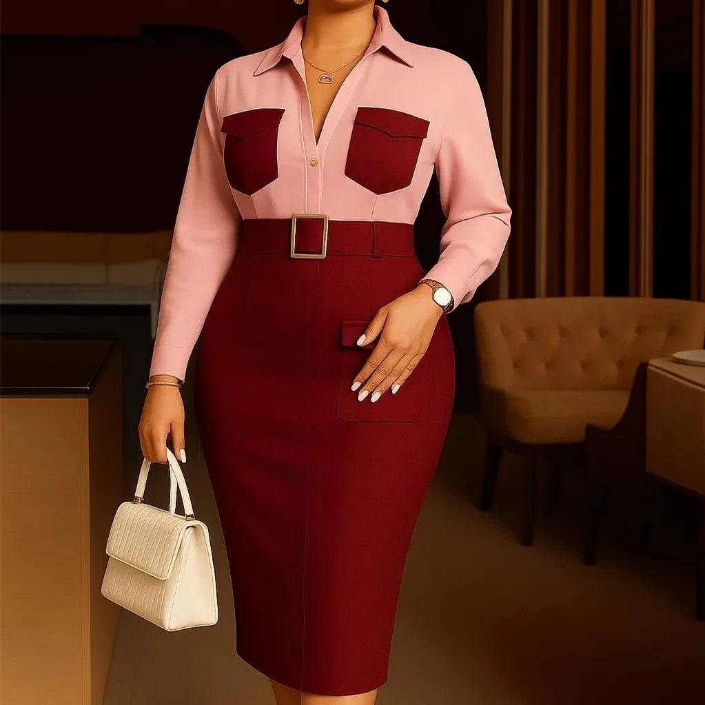 Elegant Church Dresses Long Sleeves Turn Down Collar Women Color Block Patchwork Office Ladies Work Business Autumn African New