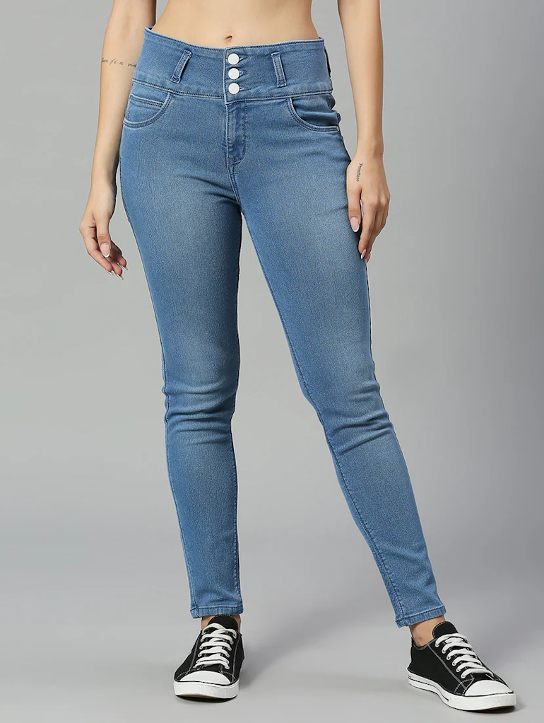 Full Length With Stretch Denim Washed Jeans With Belt - Blue