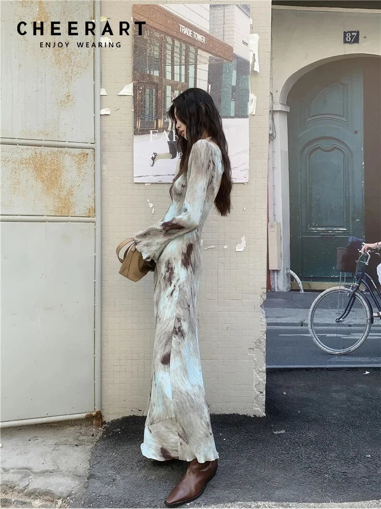CHEERART Designer Pleate French Long Maxi Dress For Women Flare Long