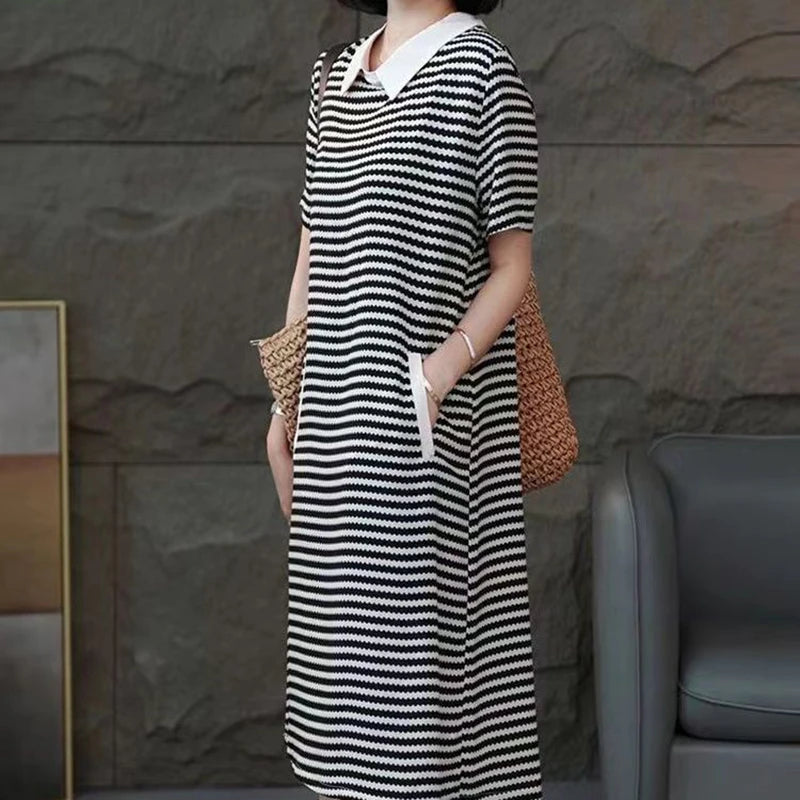 Fashion Lapel Spliced Pockets Printed Striped Casual Dresses Women's Clothing 2024 Summer New Loose Commuter Short Sleeve Dress